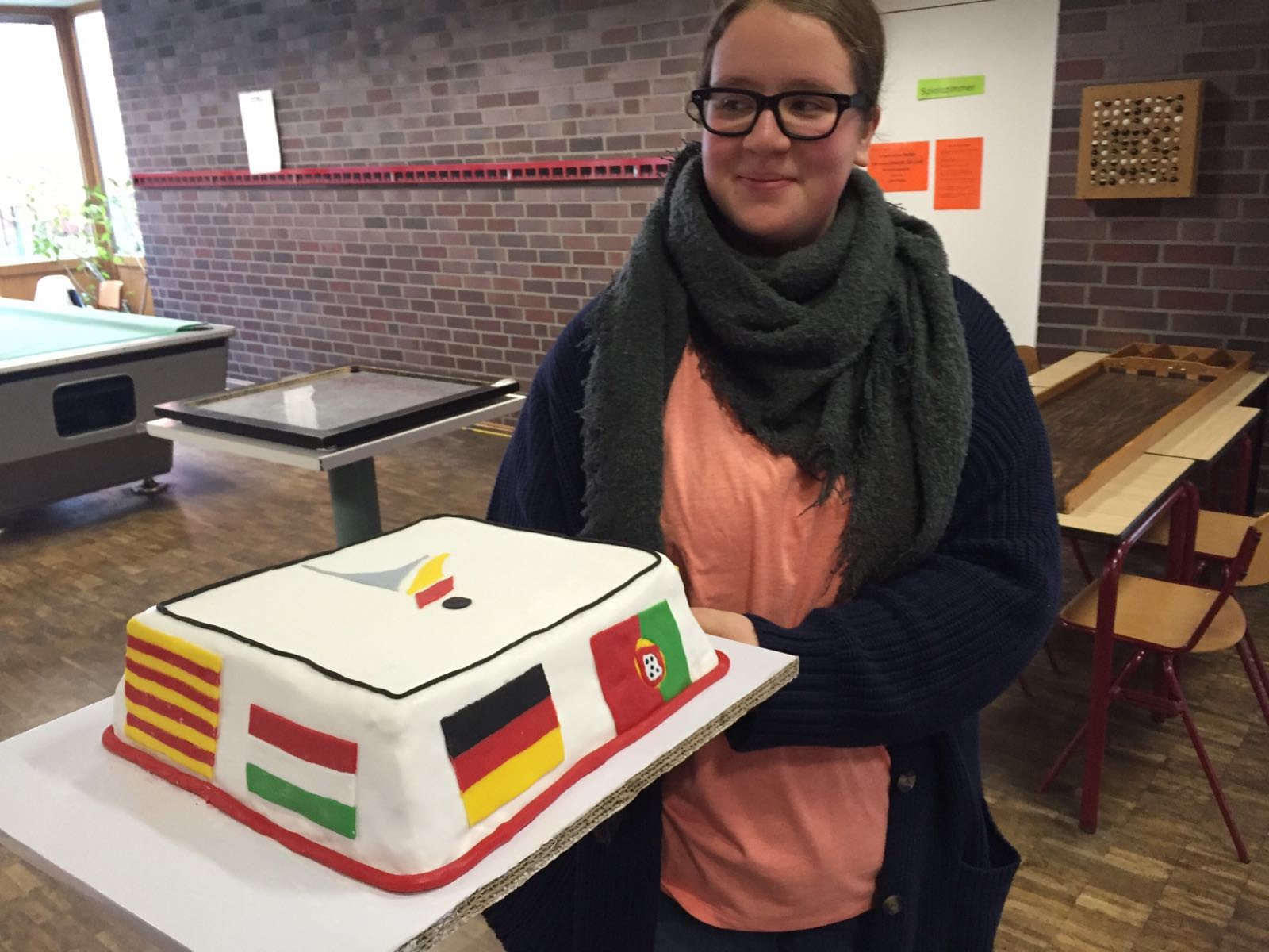 Der Euroshield Kuchen, gebacken von Anna Isbruch, steht in der Cafeteria zum Verkauf.