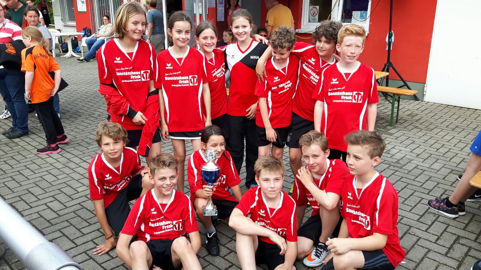 Nicht nur F-Jugend sondern auch die E-Jugend hat bei diesem Turnier einen Klasse zweiten Platz erreicht. Dadurch, das bei diesem Turnier auch in der E- Jugend Monokorfball gespielt wurde, ging die E-Jugend mit 4 Mannschaften an den Start. Auch hier zeigten alle Spieler und Spielerinnen eine klasse Leistung, so dass sich die E1 nach drei Siegen für das Finale qualifizierte. Die Siege schafften sie gegen die Mannschaft von Adler, Phönix sowie SKC E3.