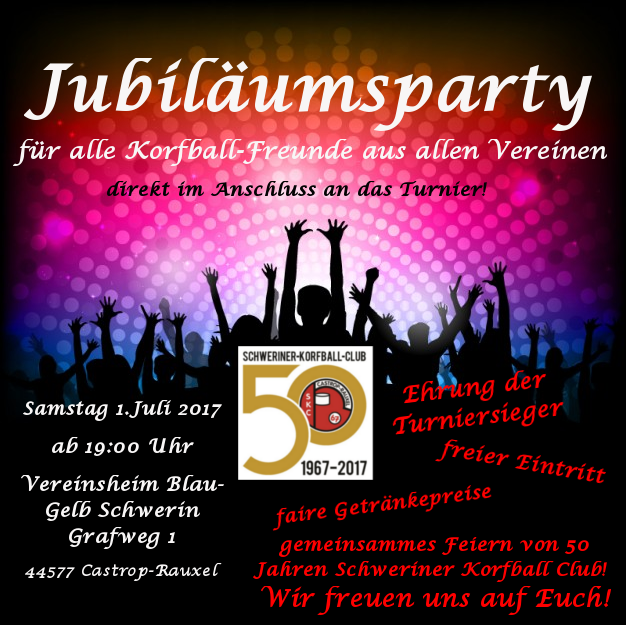 Am Samstag Abend wird es eine Korfball-Party für alle Vereine geben, die quasi mit Turnierende beginnt. Siegerehrung und Preisverleihung werden auf der Party stattfinden. Also kommt vorbei und feiert mit uns das 50jährige Bestehen!