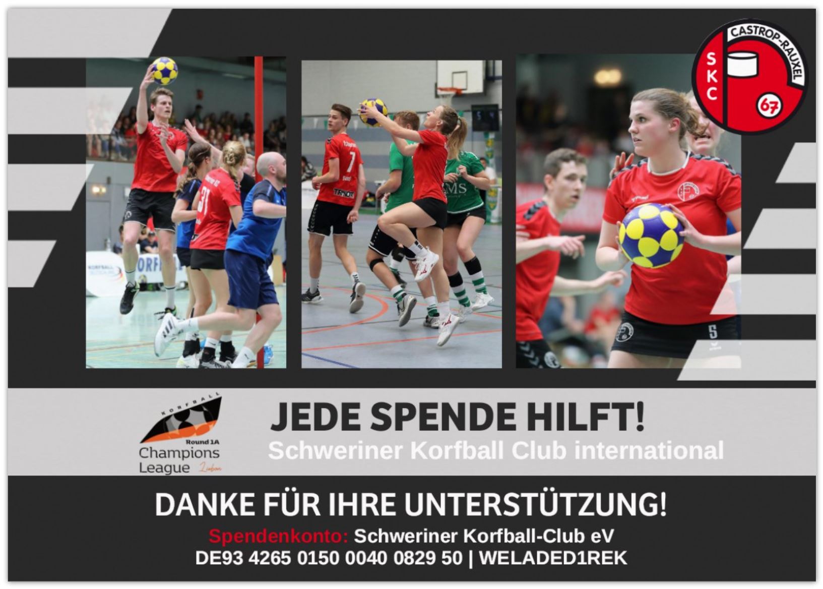 Der SKC wird diese Saison bei der Korfball Champions League mitspielen! Damit alle unsere Spieler teilnehmen können, brauchen wir finanzielle Unterstützung. Wir freuen uns über jede Spende!