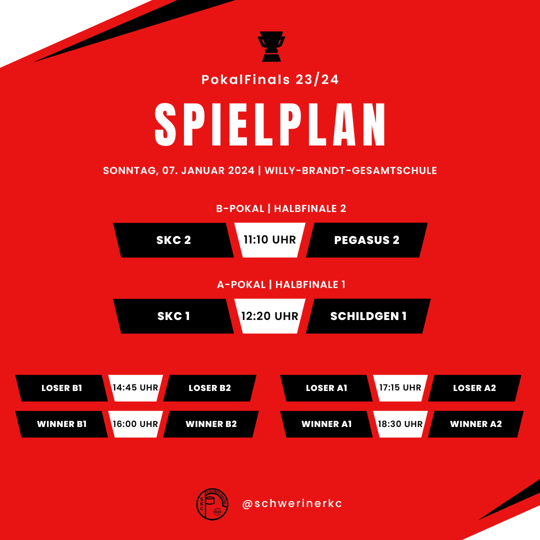 Die Spiele im A-Pokal beginnen um 12:20 Uhr mit dem ersten Halbfinale, in dem unsere S1 gegen Schildgen 1 antritt. Um 13:30 Uhr folgt das zweite Halbfinale zwischen Pegasus 1 und Adler 1. Die Sieger dieser Duelle spielen um 18:30 Uhr im großen Finale, während die Verlierer ab 17:15 Uhr um Platz 3 spielen.