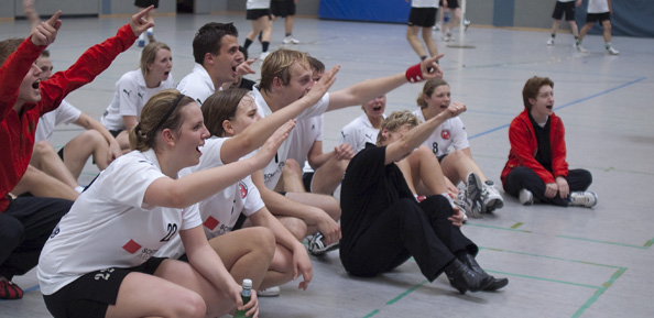Schwerin erhöht auf 9:6, Wesseling verkürzt nicht nur auf 7:9, sondern erhielt von Referee Martin Schwarze auch noch einen Strafwurf. Dessen Rechtmäßigkeit sahen die Schweriner Fans auf der Tribune natürlich gar nicht ein. Die Halle tobte. Die Pauken auf Wesselinger und Schweriner Seite lieferten sich Trommelduelle, die an schmerzhafte Dezibelzahlen reichte. Das Bergische Land erlebte Korfballstimmung von seiner besten Seite.