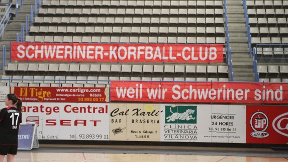 Ja, unsere neuen Banner. In Anlehnung an die übertolle Fankultur, die wir im letzten Jahr beim EuroCup in Budapest beim belgischen Meister Boekenberg erfahren durften, haben wir zwei neue Banner entworfen, gekauft und mittlerweile in der Sporthalle Garraf in Vilanova positioniert.
