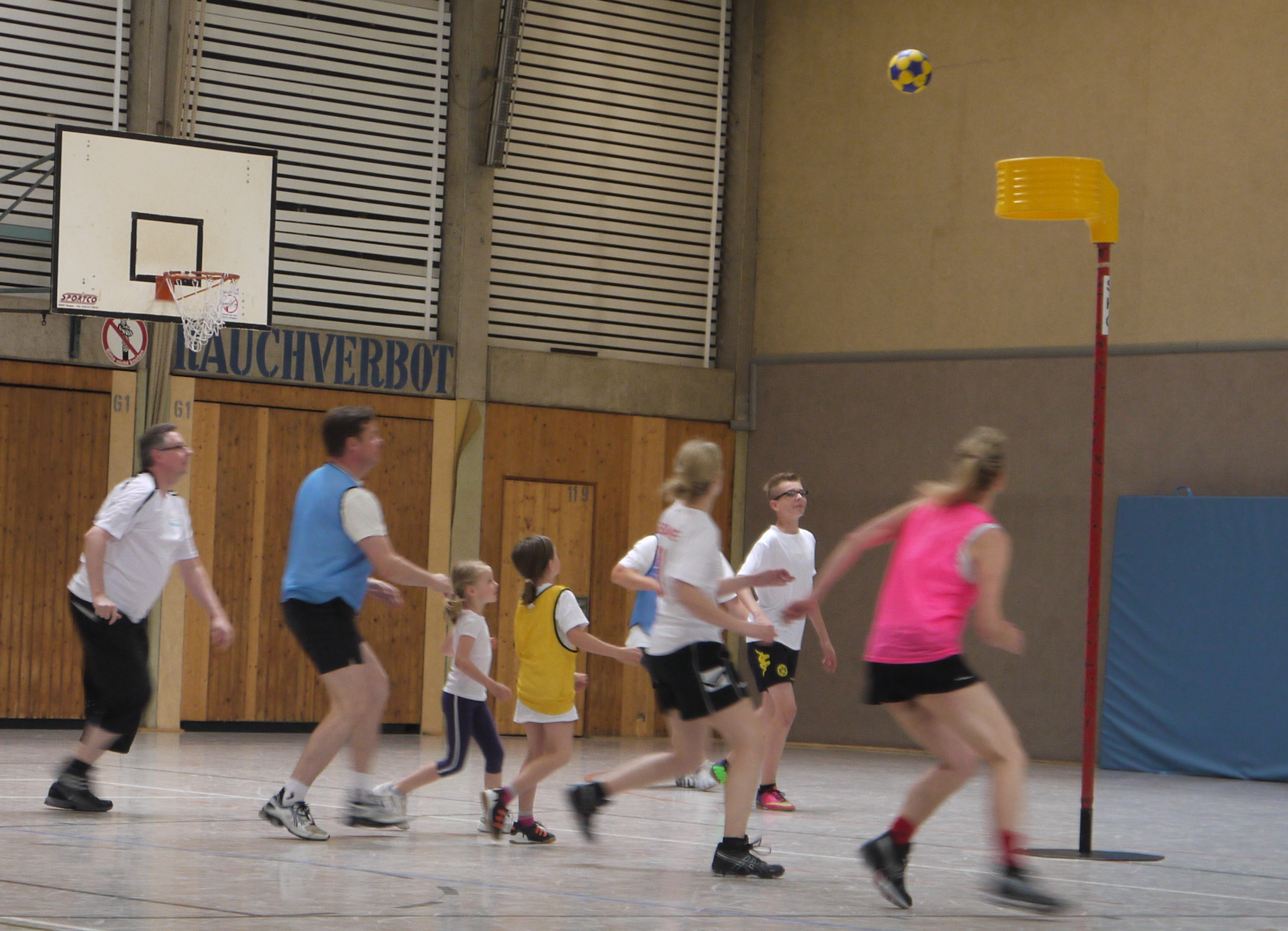 Insgesamt traten acht bunt gemischte Mannschaften gegeneinander an. Bunt gemischt heißt, dass sich die Mannschaften aus Seniorenspielern, Juniorenspielern aller Altersklassen, Geschwisterkindern und Eltern zusammensetzten. Jeder hatte an diesem Tag die Möglichkeit, einmal ein wenig in den Korfball hinein zu schnuppern. Und so entwickelten sich spannende, leicht chaotische und mit viel Spaß und Ehrgeiz geführte Spiele, in denen vor allem die Korfballlaien die schönen aber auch – gerade beim Korbwurf – frustrierenden Facetten des Korfballs erfahren konnten.