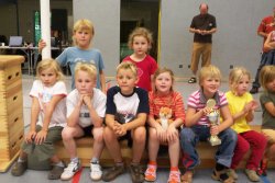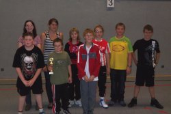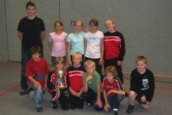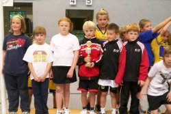 Ebenfalls einen dritten Platz erzielte die E-Jugend. Im Platzierungsspiel setzte sich die Mannschaft um die Trainer Andrea Steuer und Julian Schittkowski gegen die Vertretung der SG Pegasus mit 2:0 durch. Trotz einer Niederlage in der Vorrunde, erreichte die Spielerinnen und Spieler den ersten Platz in Gruppe A. Im Halbfinale musste sich das Team dann aber dem TV Voiswinkel, dem späteren Turniersieger, geschlagen geben. Erfolgreichster Korbschütze war Lucas Witthaus mit 4 Körben. | ![]() Foto: Siegerehrung E-Jugend |