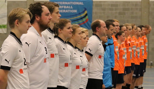Die Aufstellung der Anfangsacht des SKC beim Abspielen der IKF Hymne. Foto: Schittkowski