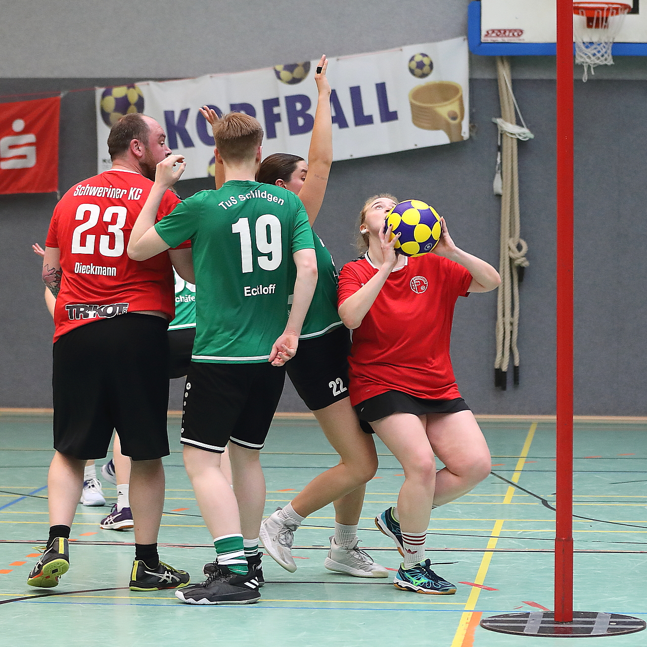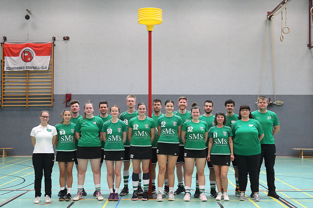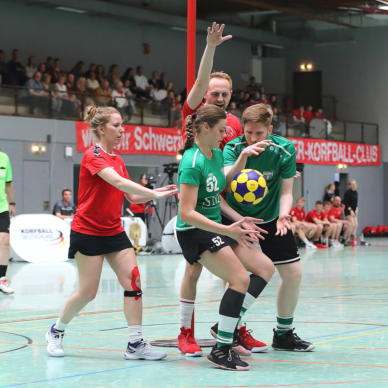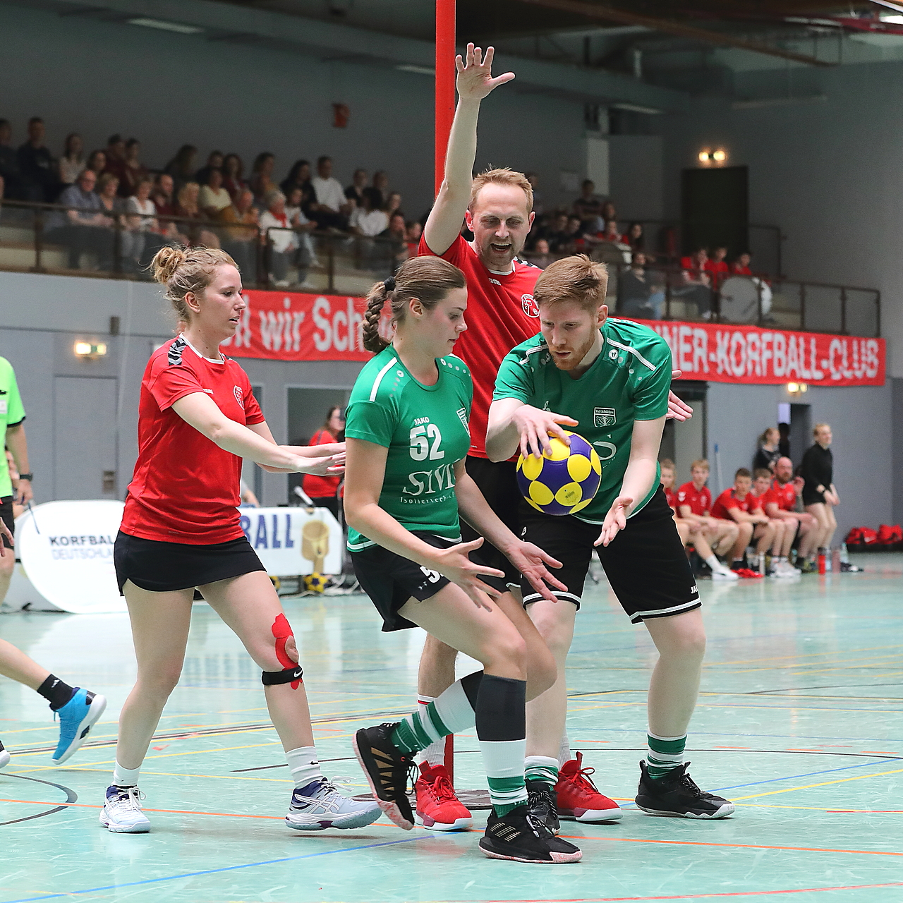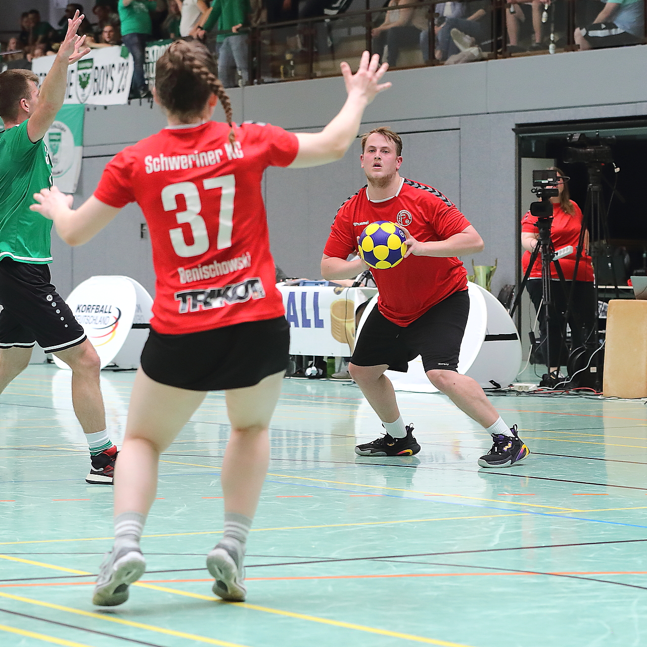 Am 13.05.2023 fanden die Finalspiele der Seniorenklasse statt. Vom Schweriner KC waren die erste und die dritte Mannschaft vertreten. In dieser Galerie werden die Fotos des Oberliga Finales Schildgen 3 gegen SKC 3 gezeigt. Das Spiel endete aus Schweriner Sicht mit einer unglücklichen Niederlage von 22:21 (Fotos Gertrude de Vries, korfballfoto.de)