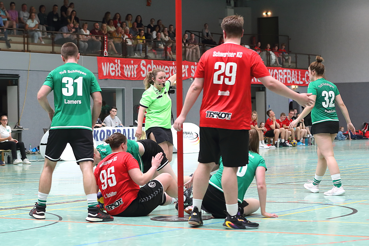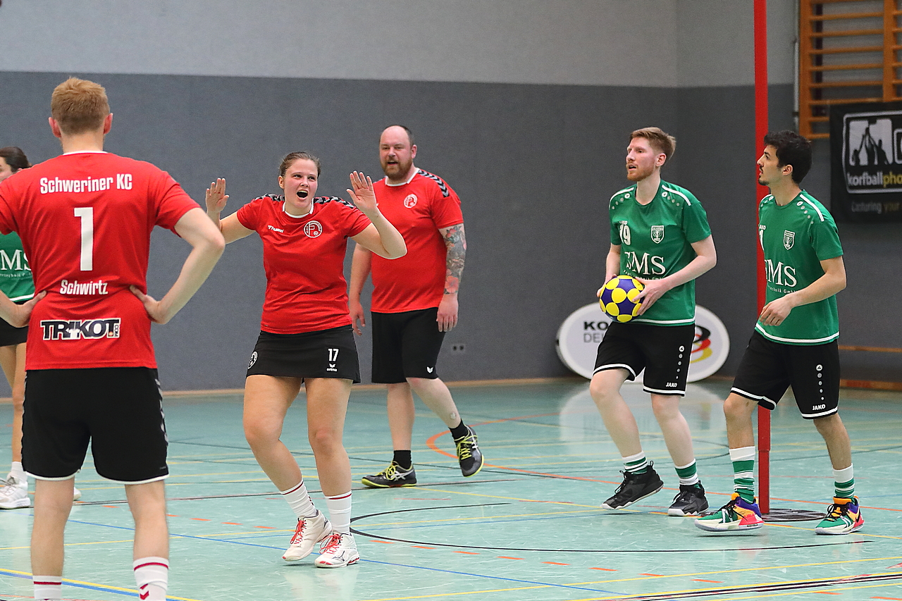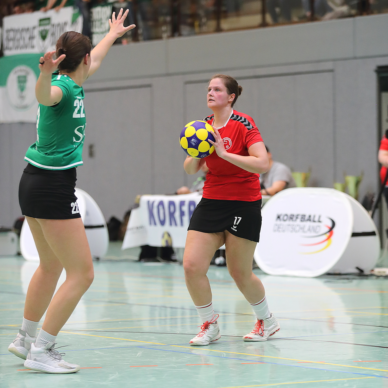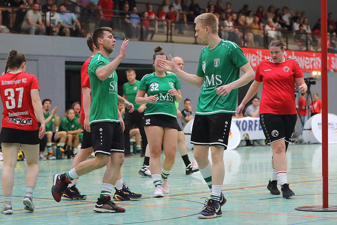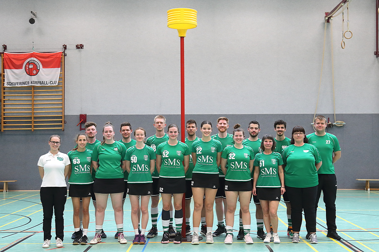 Am 13.05.2023 fanden die Finalspiele der Seniorenklasse statt. Vom Schweriner KC waren die erste und die dritte Mannschaft vertreten. In dieser Galerie werden die Fotos des Oberliga Finales Schildgen 3 gegen SKC 3 gezeigt. Das Spiel endete aus Schweriner Sicht mit einer unglücklichen Niederlage von 22:21 (Fotos Gertrude de Vries, korfballfoto.de)