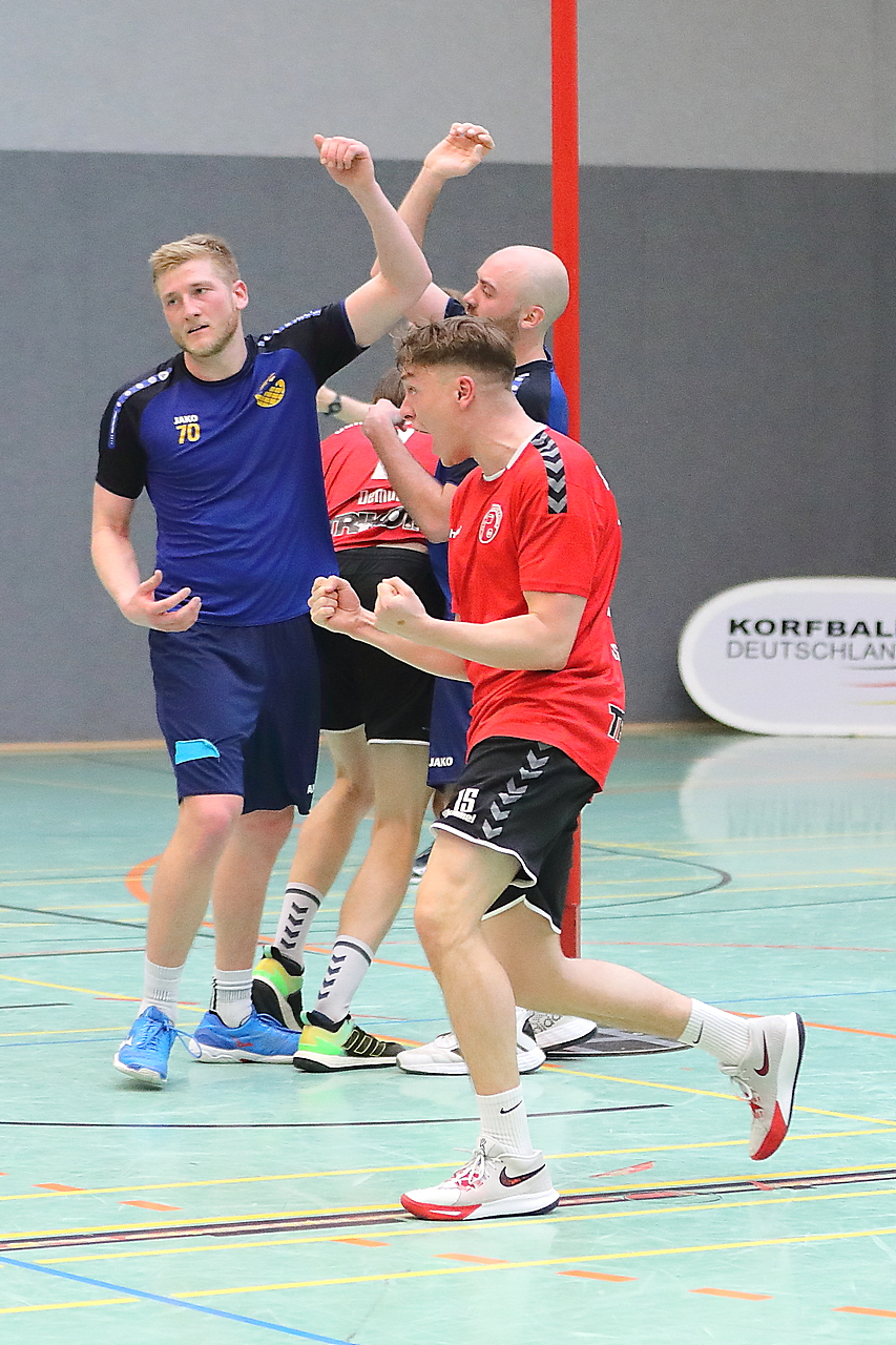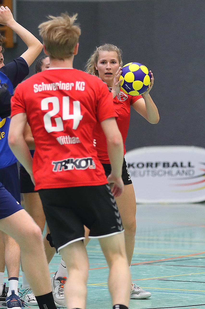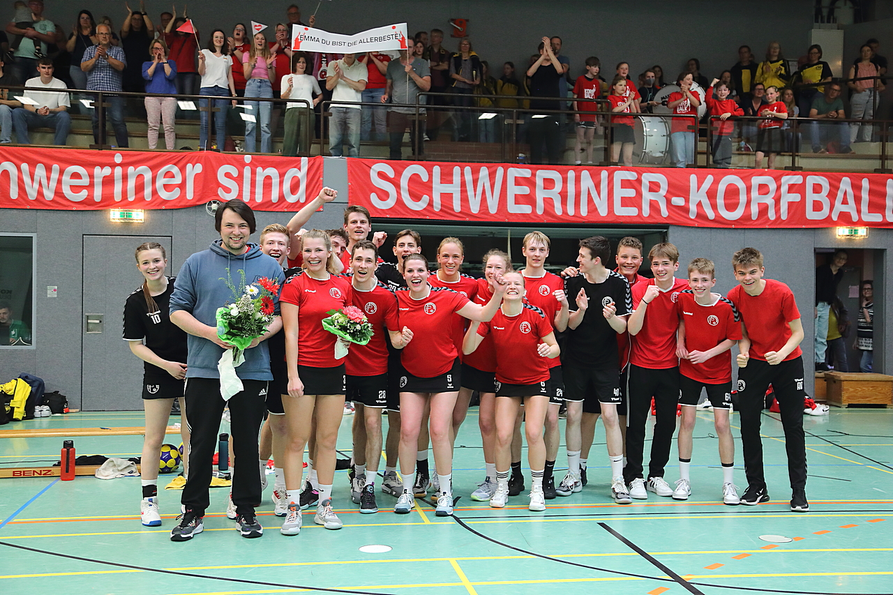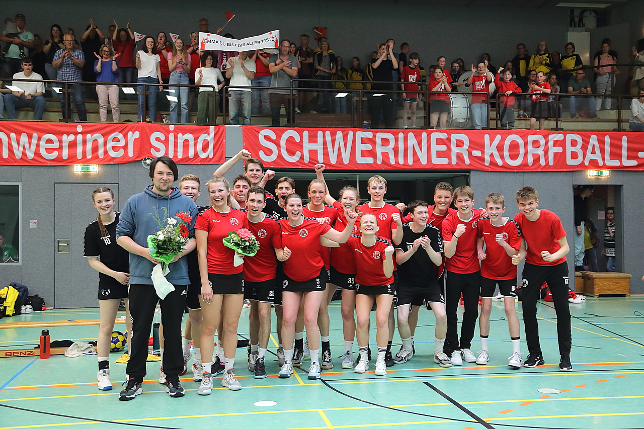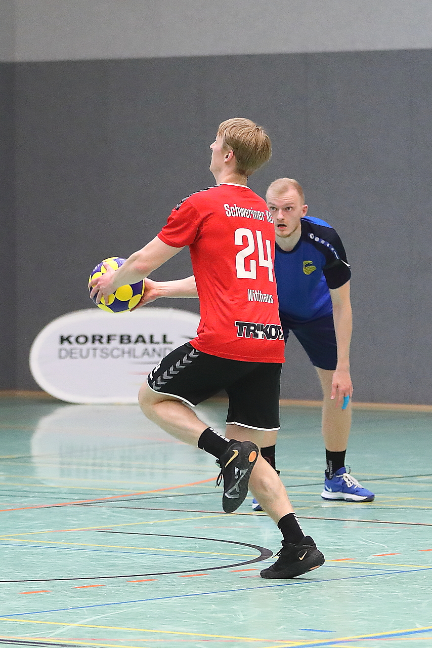 Am 13.05.2023 fanden die Finalspiele der Seniorenklasse statt. Vom Schweriner KC waren die erste und die dritte Mannschaft vertreten. In dieser Galerie werden die Fotos des Regionalliga Finalspiels um Platz 3 Adler 1 gegen SKC 1 gezeigt. Das Spiel endete mit einem Schweriner Sieg von 17:18 (Fotos Gertrude de Vries, korfballfoto.de)