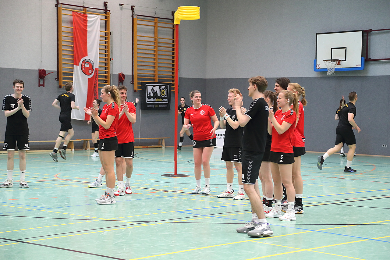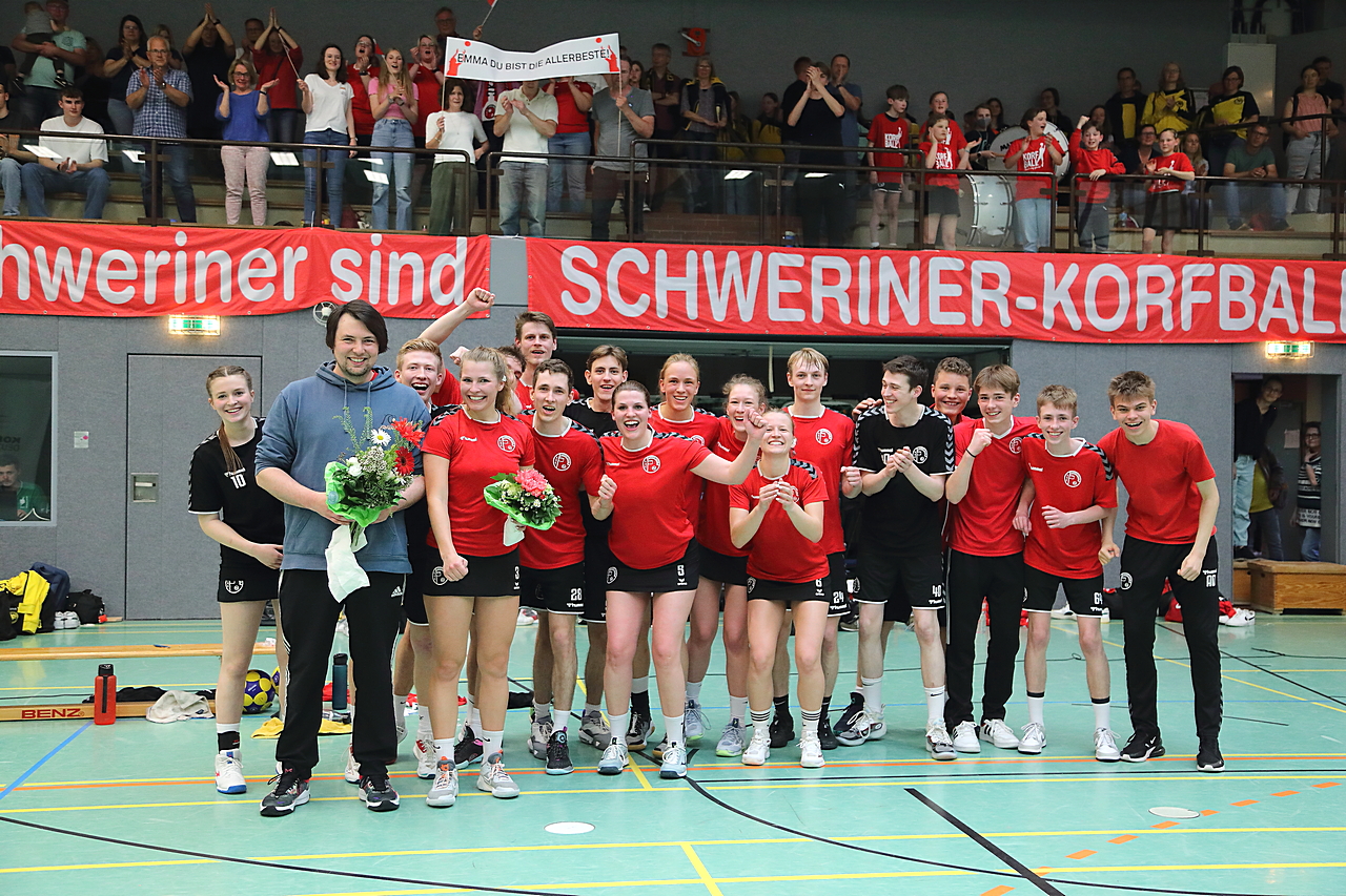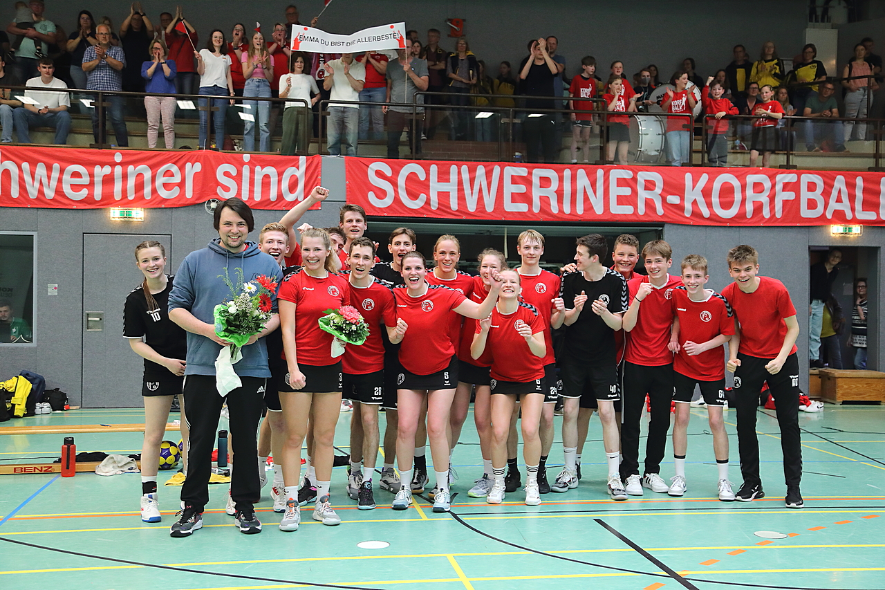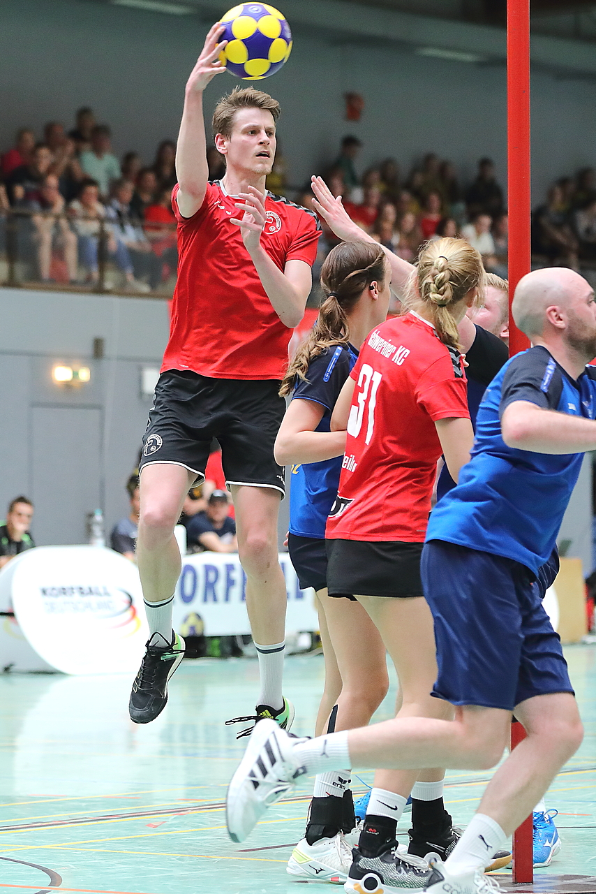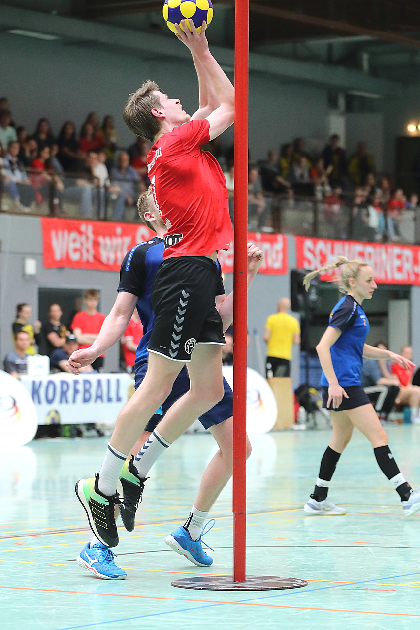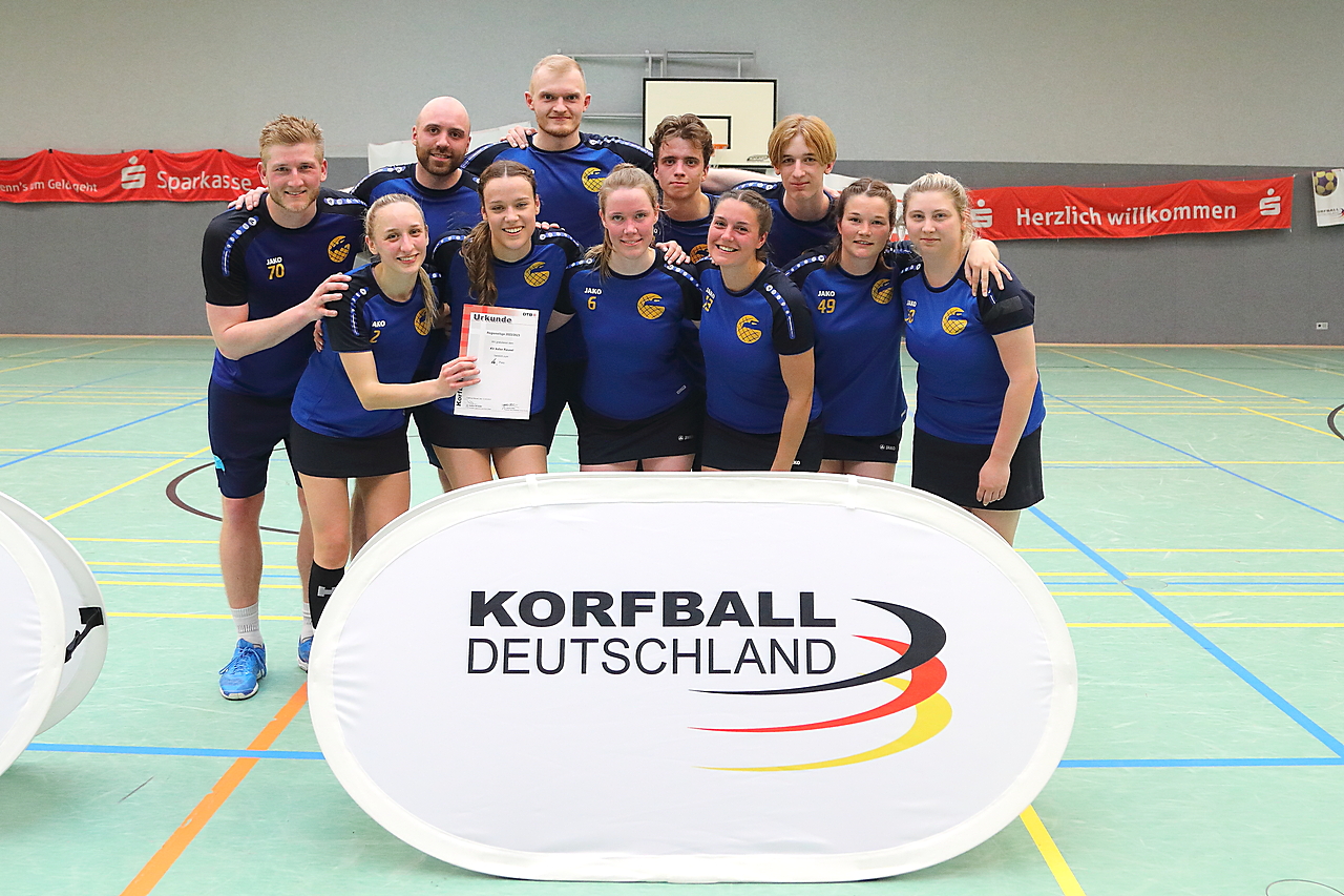 Am 13.05.2023 fanden die Finalspiele der Seniorenklasse statt. Vom Schweriner KC waren die erste und die dritte Mannschaft vertreten. In dieser Galerie werden die Fotos des Regionalliga Finalspiels um Platz 3 Adler 1 gegen SKC 1 gezeigt. Das Spiel endete mit einem Schweriner Sieg von 17:18 (Fotos Gertrude de Vries, korfballfoto.de)