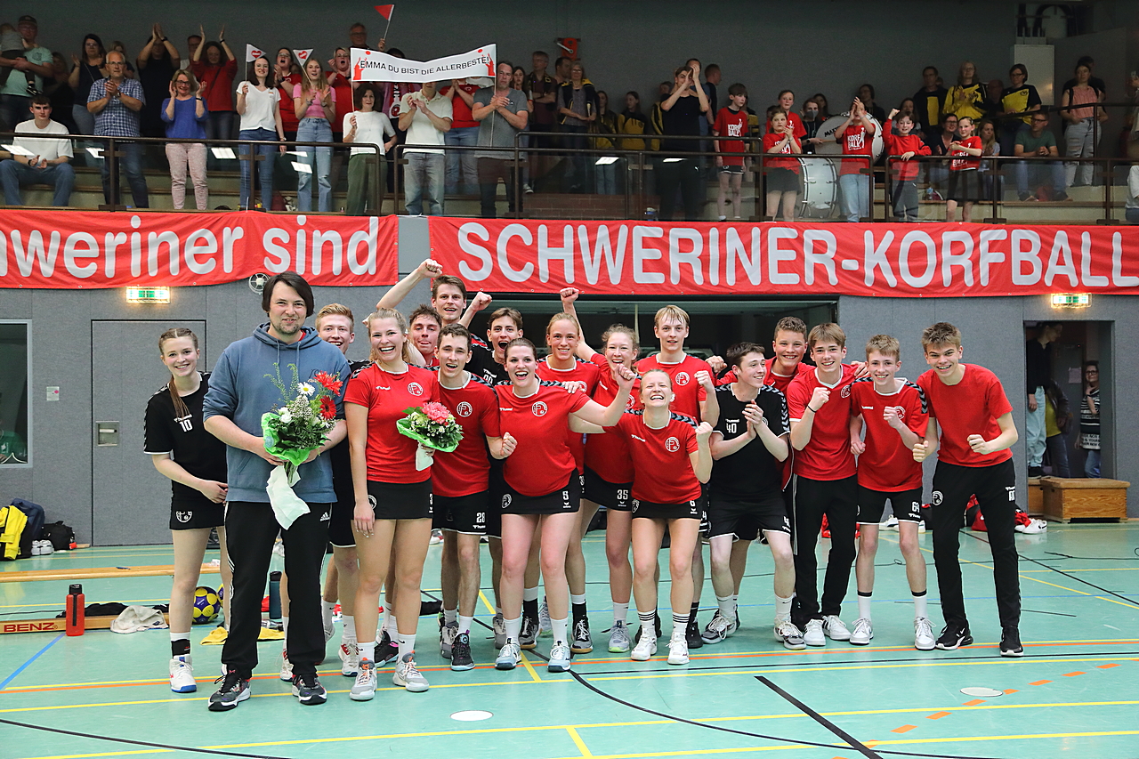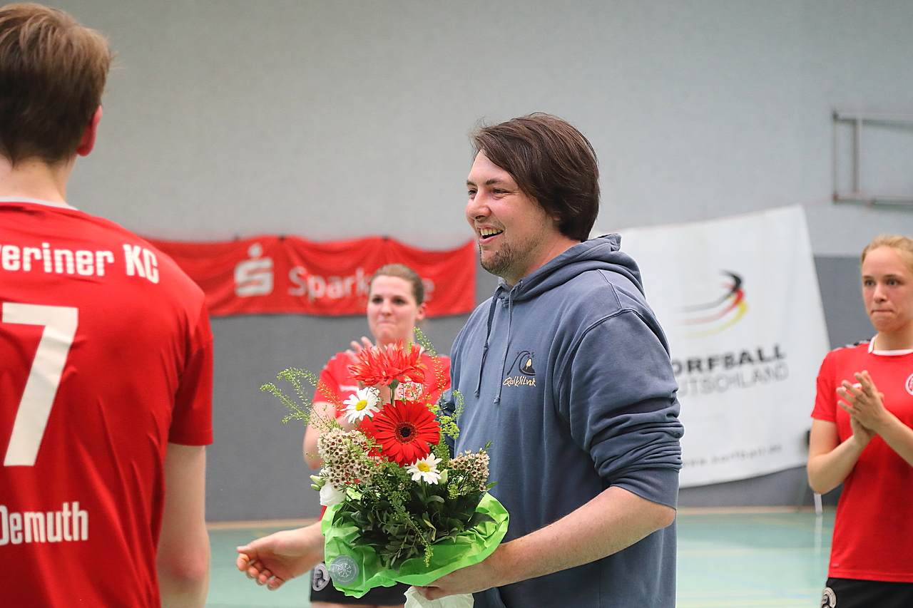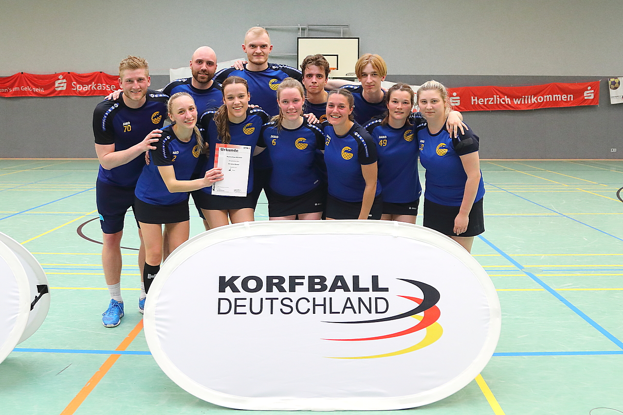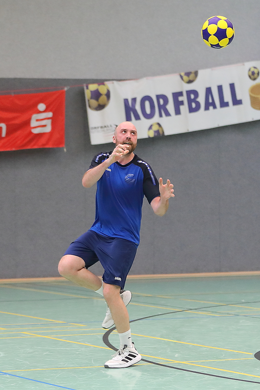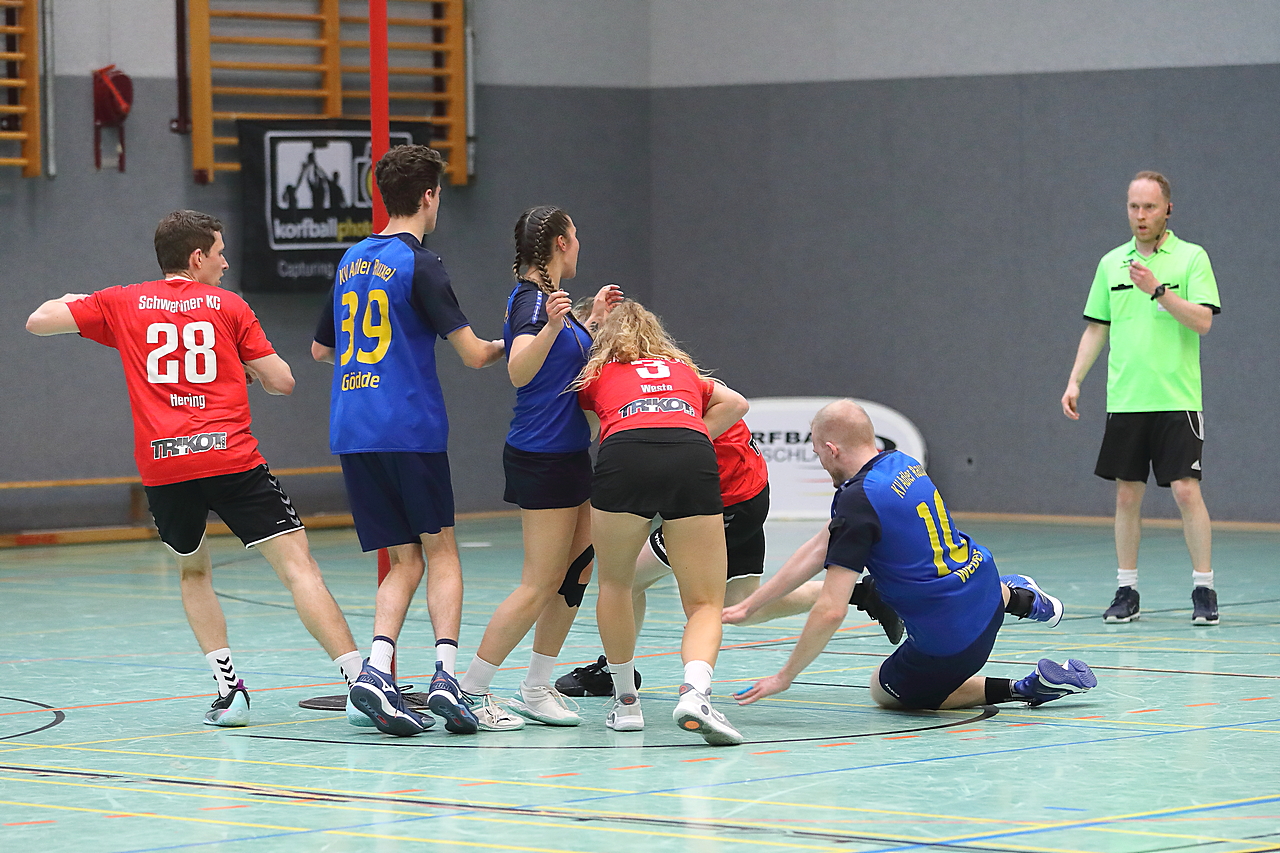 Am 13.05.2023 fanden die Finalspiele der Seniorenklasse statt. Vom Schweriner KC waren die erste und die dritte Mannschaft vertreten. In dieser Galerie werden die Fotos des Regionalliga Finalspiels um Platz 3 Adler 1 gegen SKC 1 gezeigt. Das Spiel endete mit einem Schweriner Sieg von 17:18 (Fotos Gertrude de Vries, korfballfoto.de)
